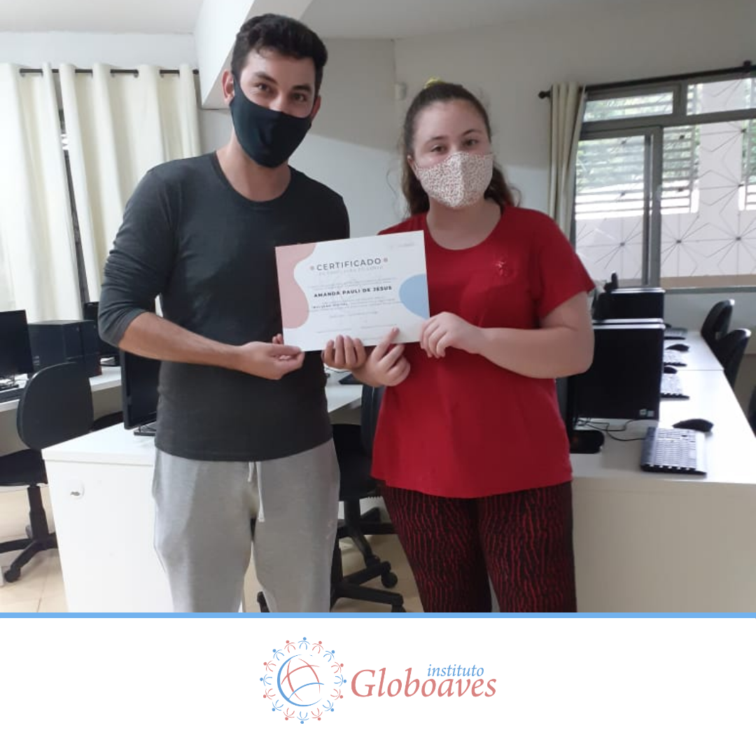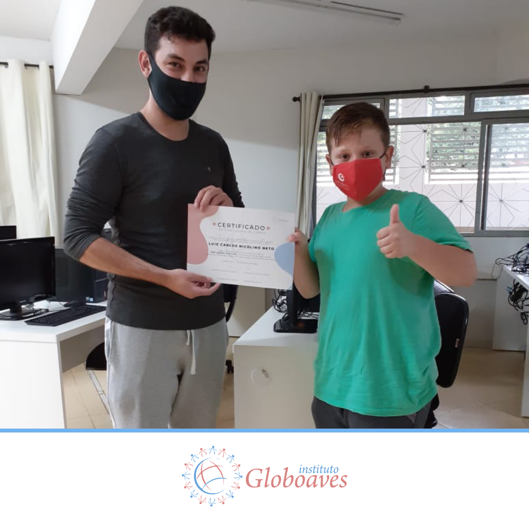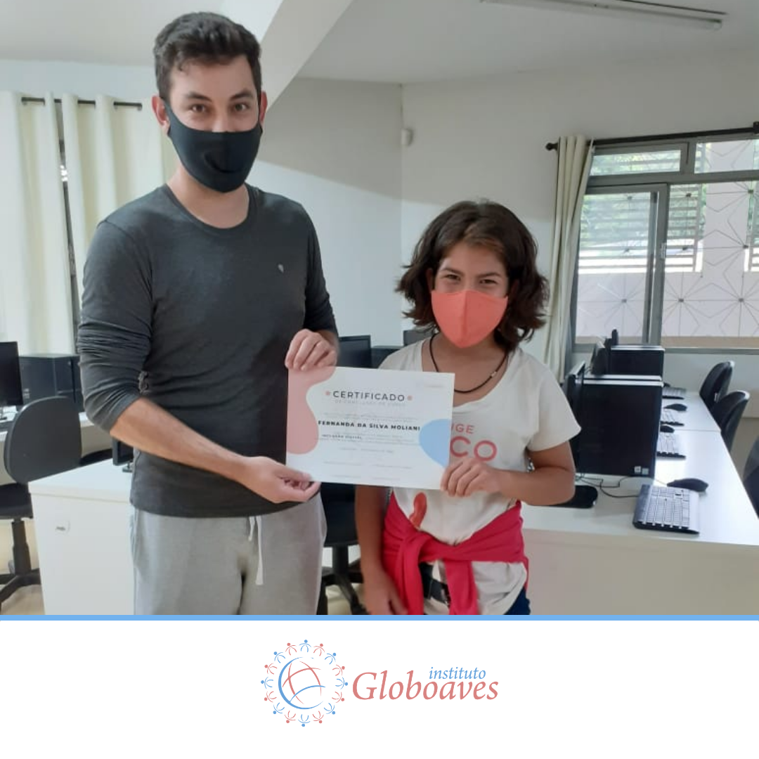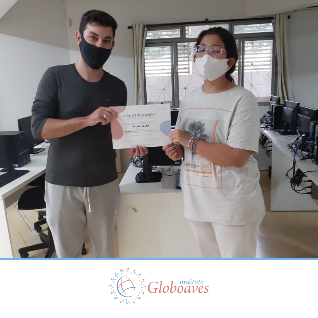 Em dezembro foi realizada a confraternização da turma de 2020 do Projeto Inclusão Digital, com entrega de certificados aos alunos, pelo professor Leandro Ramalho e a Coordenadora do Instituto Globoaves, Marcia Nogueira.